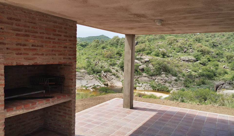 Galería y cochera cubierta integrada a la cabaña, con asador.