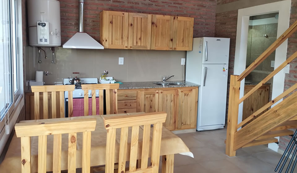 Cocina totalmente equipada con heladera, cocina de 4 hornallas con horno y parrilla, termotanque y vajilla completa.